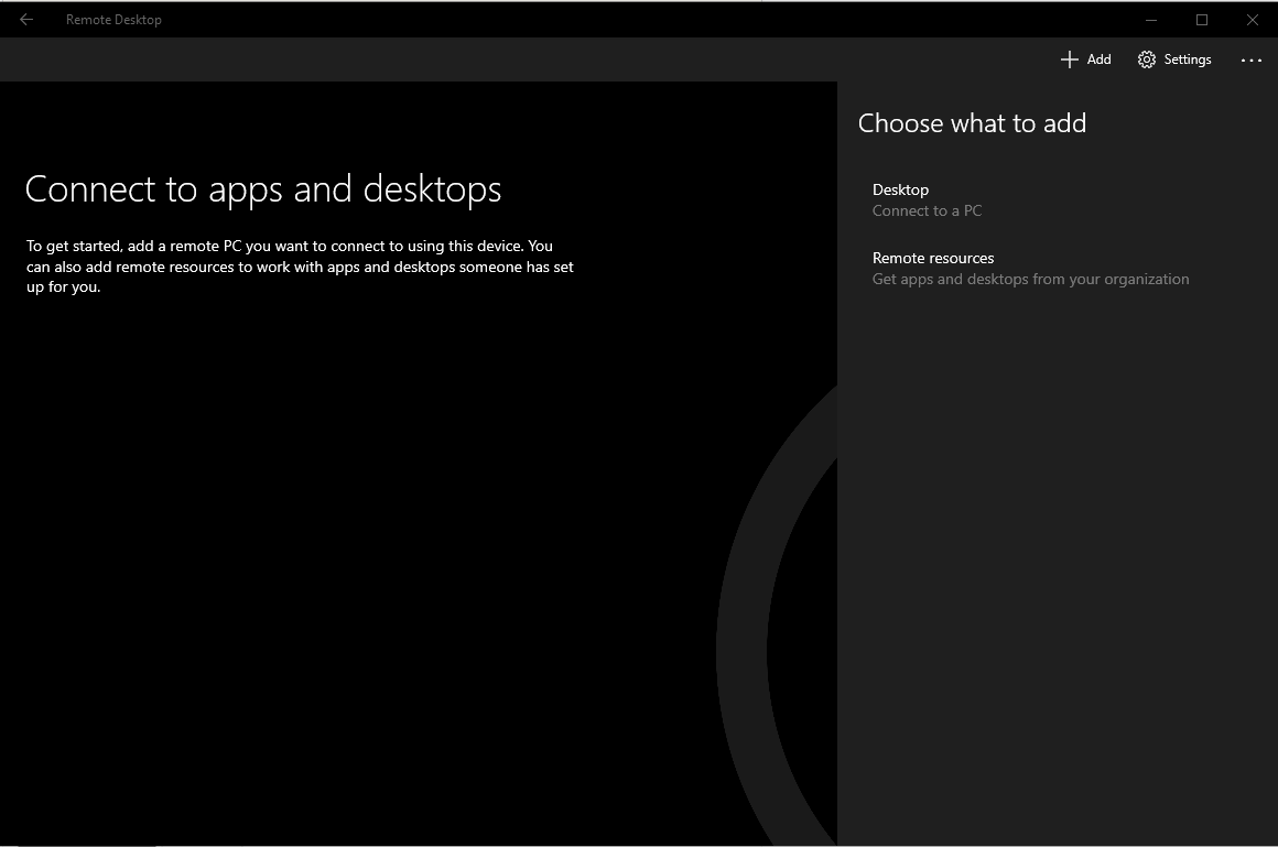 Based on the screen shot, this looks like it is using the RDP connection portion. Here is a blank canvas. It is only available through the Windows Store (but, you don’t need to log into the store to install it). When you get used to it, I find it kinda slick but limited. There doesn’t seem to be an ability(for a standard user) to export a configuration file like you can with mstsc.exe (.rdp) but this app can open them if I recall.