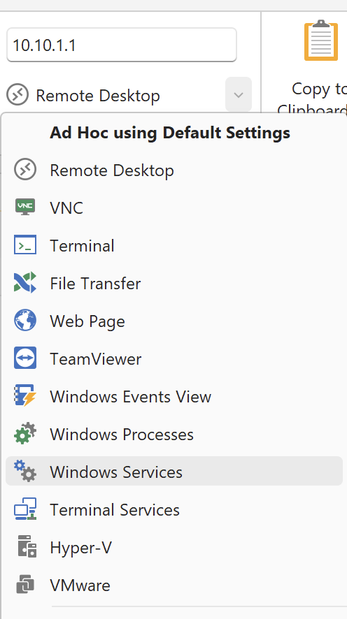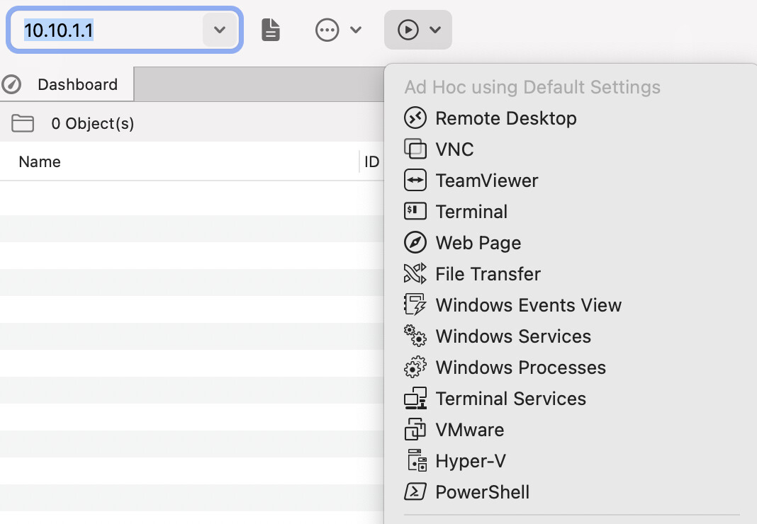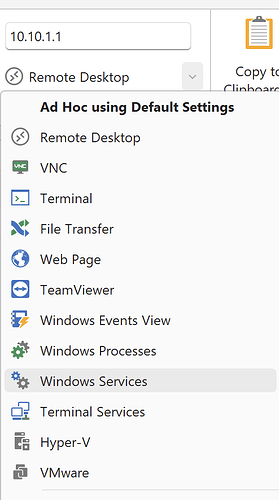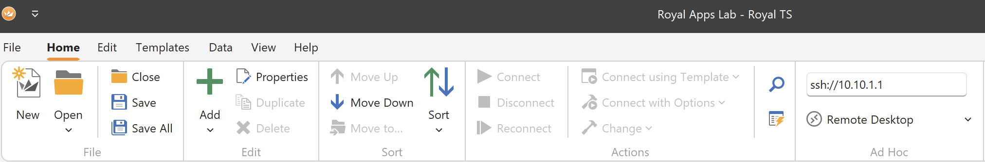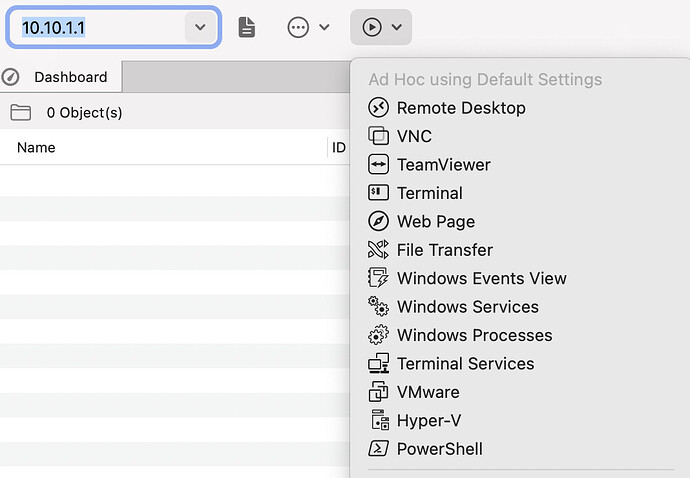 As of Royal TS (for Windows) V3 and Royal TSX (for macOS) V2.2 we have extended the ad hoc connection feature in the ribbon/toolbar to quickly create the correct ad hoc connection based on the defaults.