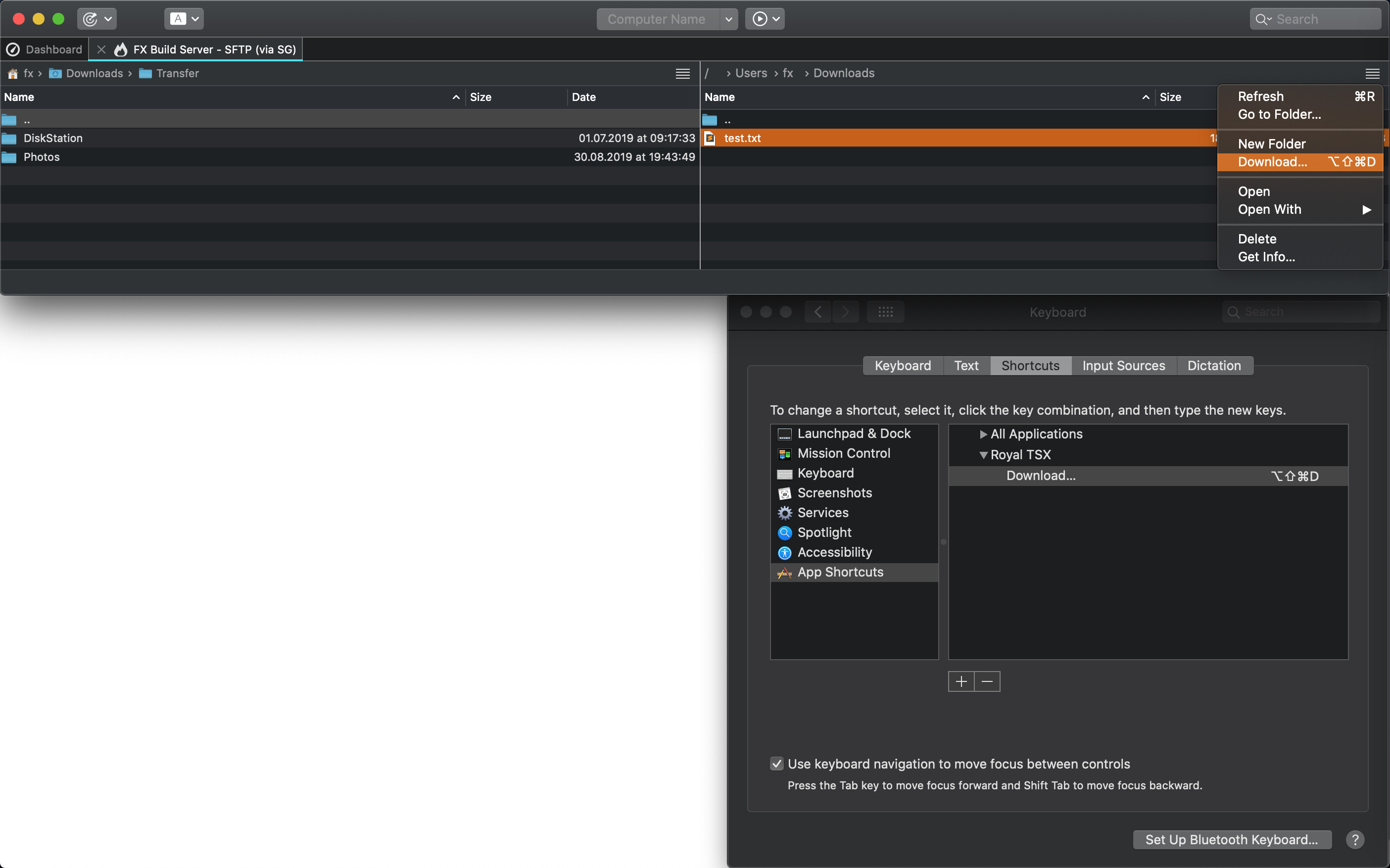 I tested some more, and the keyboard shortcut got attached to the File Transfer’s “Download…” context menu action, BUT it is not shown in the context menu. So it’s sort of a bug I guess, but only visual. When I click on the “sandwich” menu in the toolbar, I can see the keyboard shortcut next to “Download…” command, and the shortcut actually works when pressed.