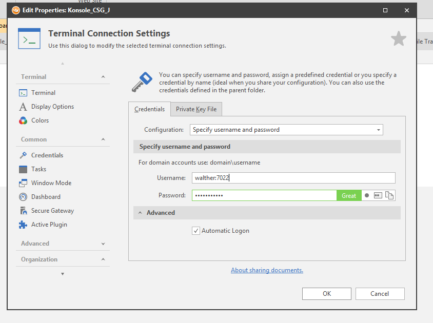 My current solution is to use the “specify username and password” option under the credentials tab. With the drawback: I have to take care of the credentials in every single terminal object.
