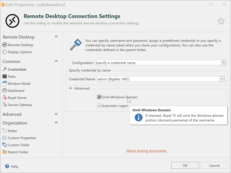 This is generally required for RDP connections, but we have some SSH servers that are AD integrated and do NOT want the domain\ value. Is there a way to specify the use of an existing credential but somehow utilize the logic behind $EffectiveUsernameWithoutDomain$ to pass a username? Maybe a connection specific checkbox to not pass the domain?