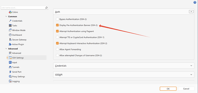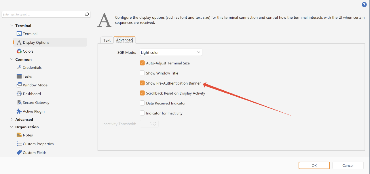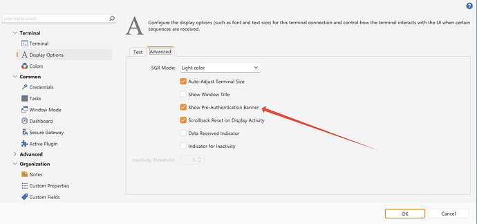 Depending on which terminal plugin you are using, there are different steps you need to follow to disable the Pre-Authentication Banner. For Rebex-based connections, you can find the setting in the properties of the connection under “Terminal - Display Options - Advanced”: