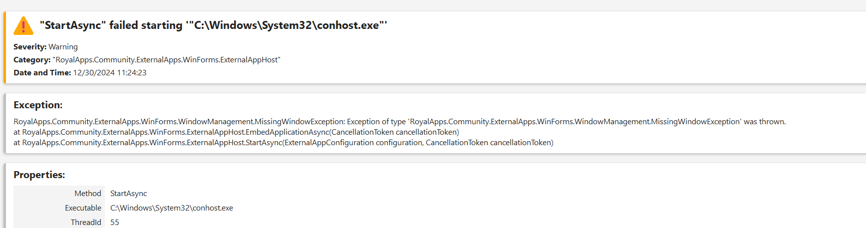 However i dont seem to be able to get it to stay embedded when i double click a connection - it launches a command prompt which works fine - but RoyalTS loses control of it, and puts an error in the log.