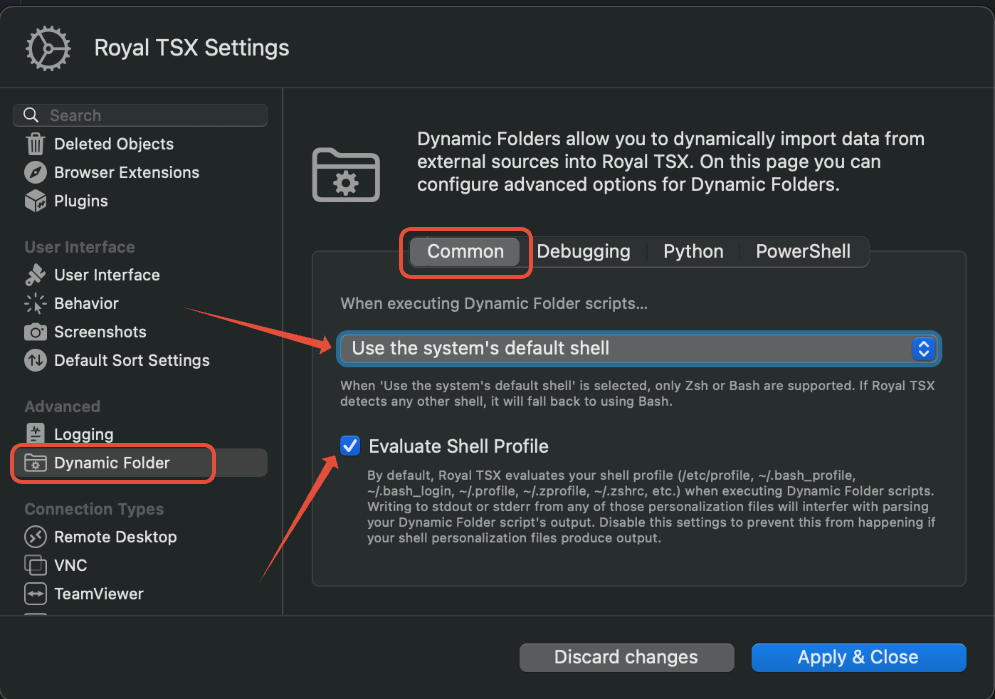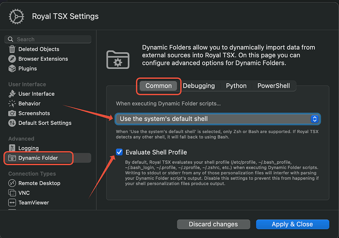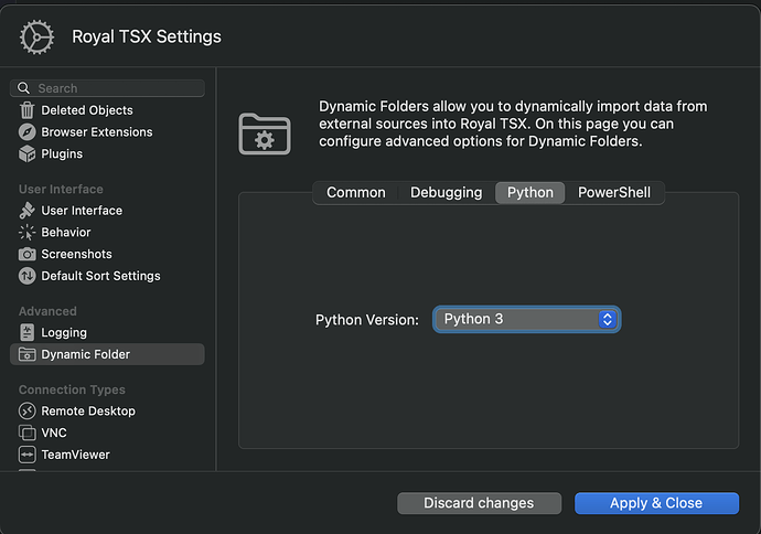 can you please make sure the following settings are configured within the “Royal TSX Settings > Advanced > Dynamic Folder” section: