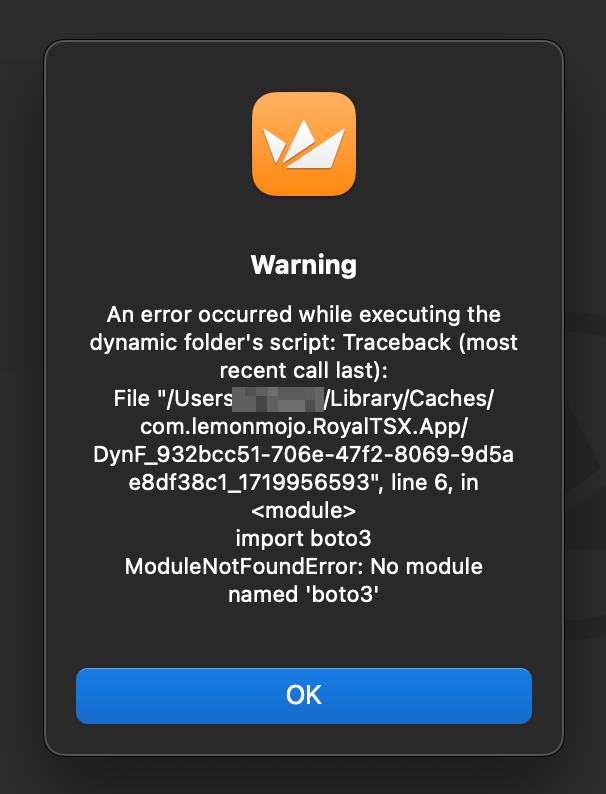 I am on Royal TSX (for macOS) version 6.1 and trying to run Python script using 3rd party libraries e.g boto3 in dynamic folder. However for libraries installed via pip/pip3 (installed globally) getting following error.