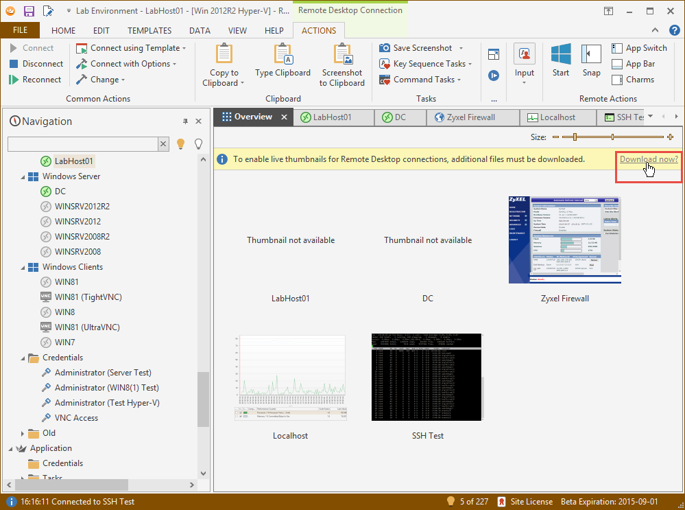 Switching to the Overview tab for the first time will show a yellow banner which states that additional files are necessary to display Remote Desktop live thumbnails: