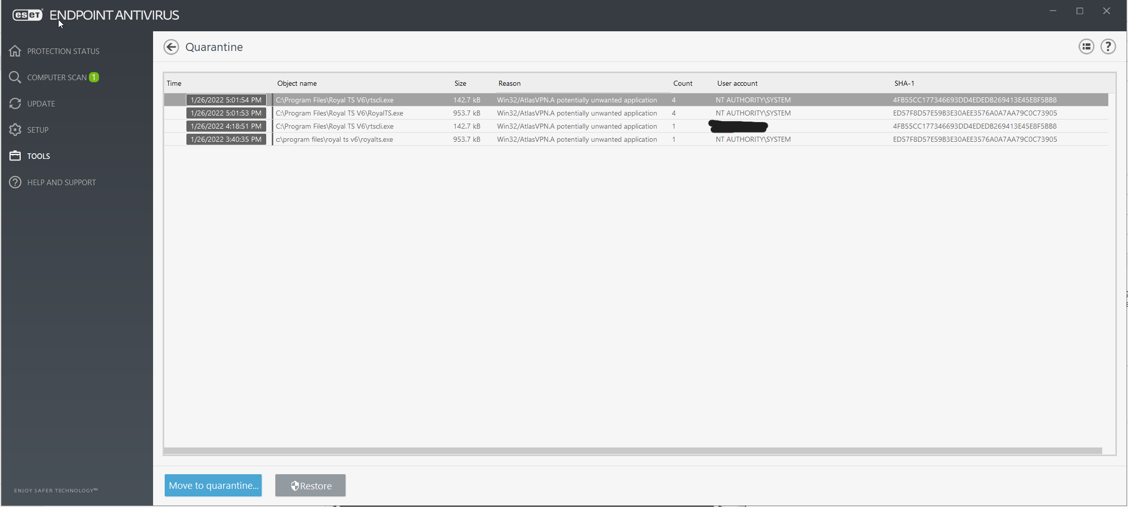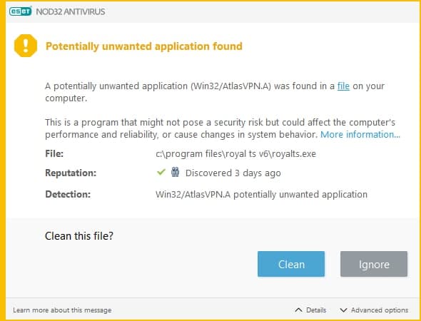 This happened to me as well. The newest version of Royal TS is triggering an Atlas VPN warning. I upgraded to the latest version today, only to find my RoyalTS program files in the quarantine. I had to downgrade to get it working again. I cannot add any exclusions since I’m on an enterprise device.