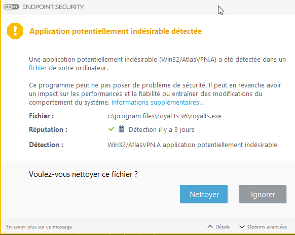 we’ve received a number of tickets from various customers who have been notified that the latest version of Royal TS contains an unwanted file (Malware). This is a false-positive detection and, unfortunately, has to be addressed by ESET.