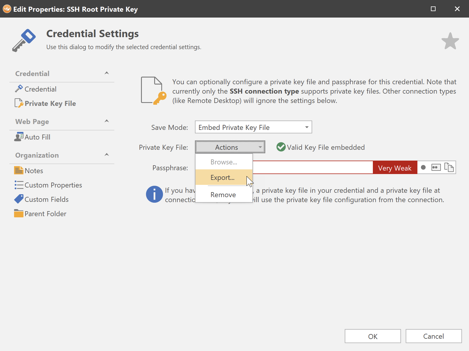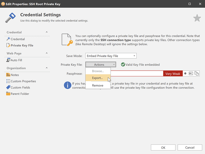 “Support for exporting embedded private key files from documents” on this page https://www.royalapps.com/ts/win/features-all