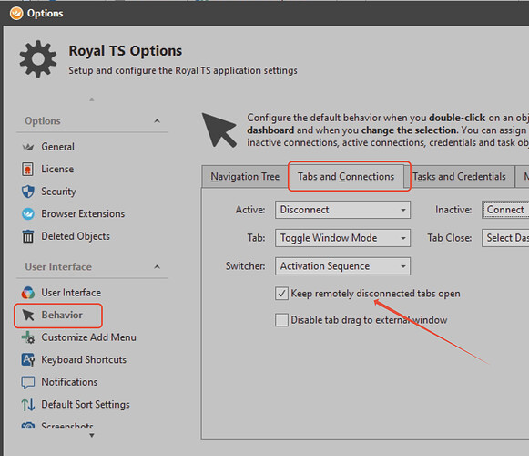 - Within the Royal TS - Behavior Options, go to ‘Tabs and Connections’ and activate the ‘Keep remotely disconnected tabs open’ option: