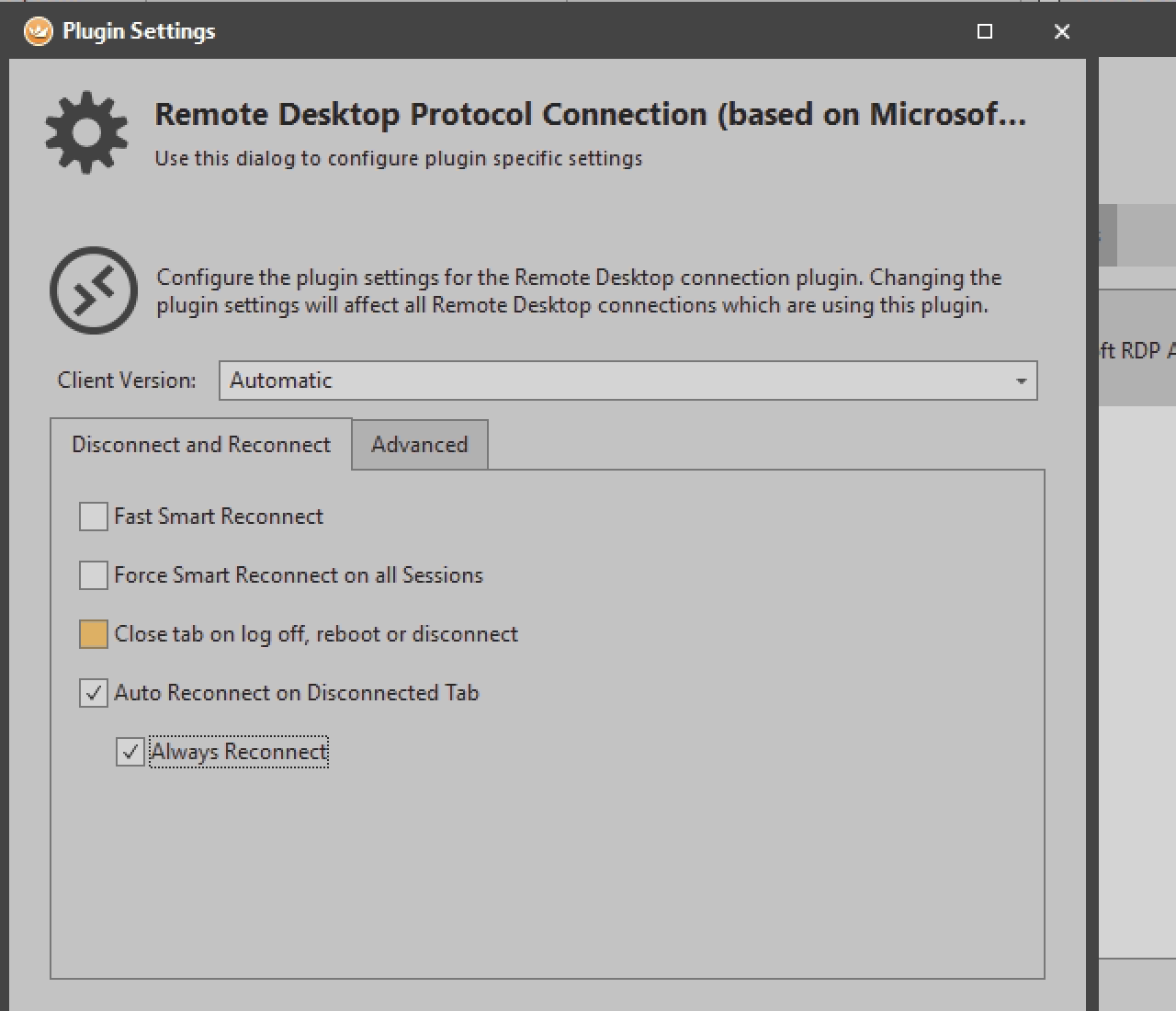 Once the settings are opened, select the options ‘Auto Reconnect on Disconnected Tab’ and ‘Always Reconnect’