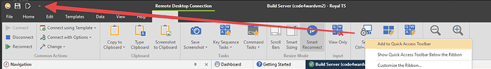 the context menu is a generic one (suitable for all connection types) and it’s hard to put connection specific items in it and keeping it lean and clean at the same time. Royal TS has many other customization features which can make your life easier and more efficient. For example, you can put this button to the Quick Access Toolbar by right-clicking it: