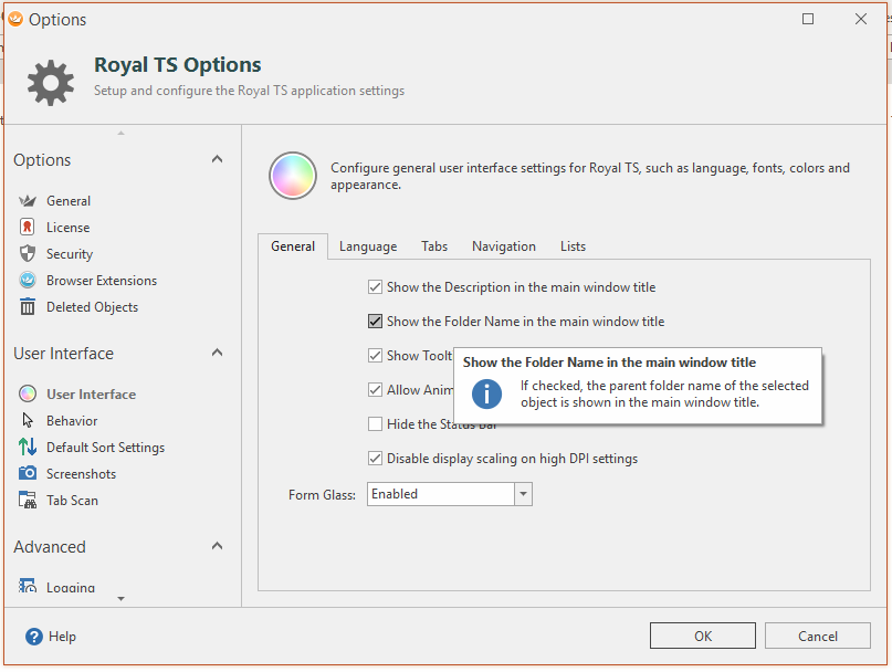 Displaying the parent folder name within the tab may increase the width of the tab a lot, probably this may reduce the overview when having a lot tabs opened at the same time. May it help if the folder name is being shown in the main window title? We do have a option at “Royal TS Options -> User Interface -> General -> Show the Folder Name in the main window title”: