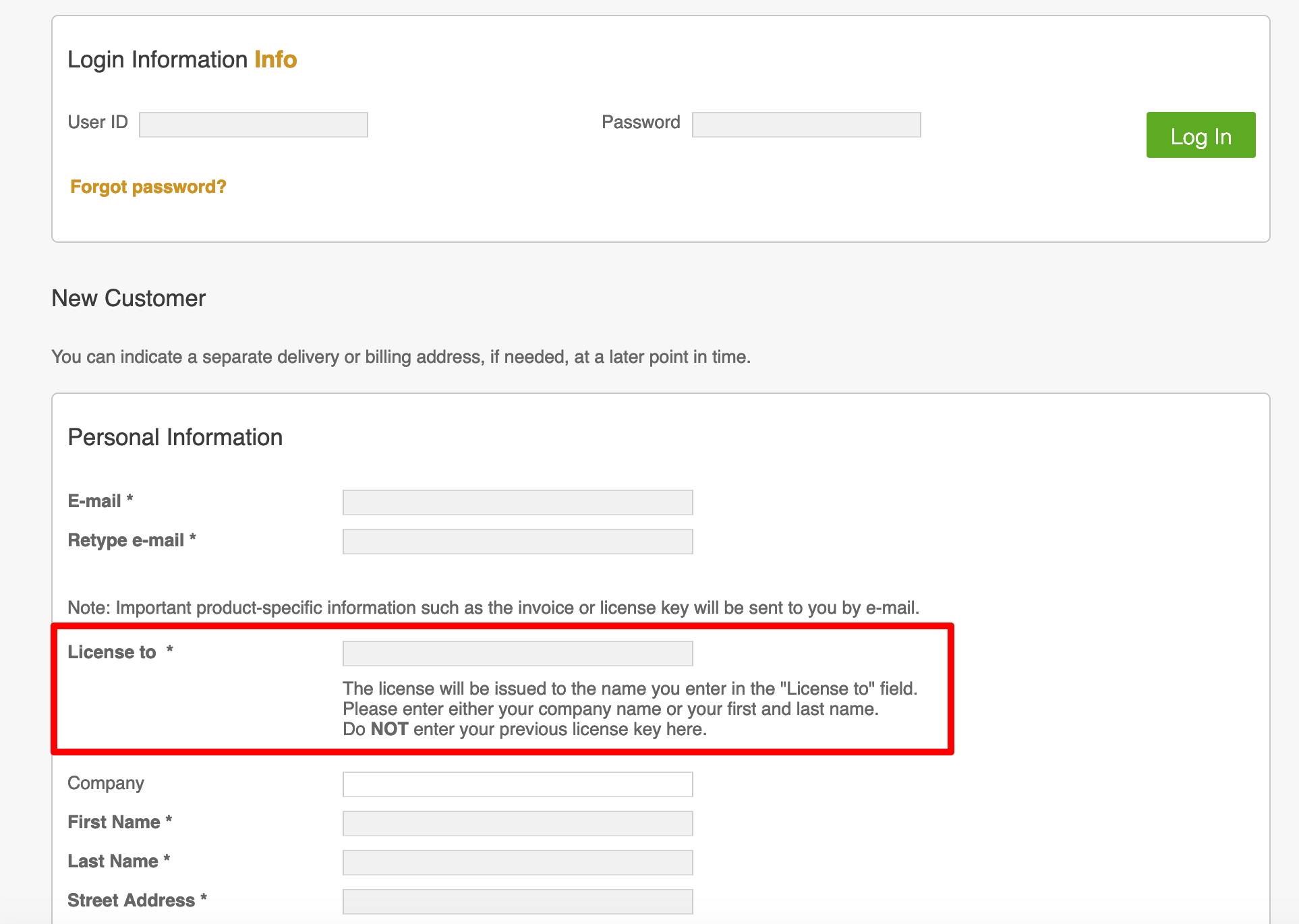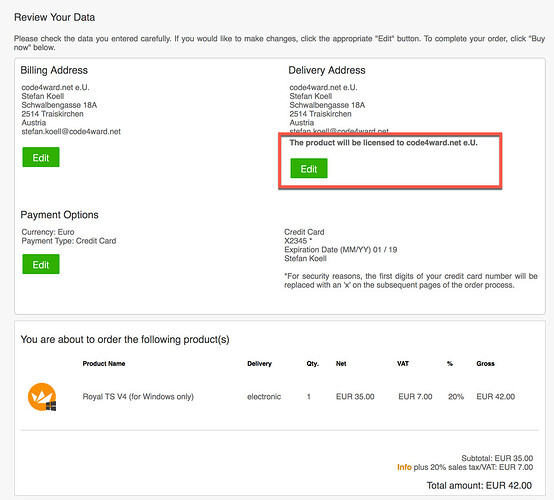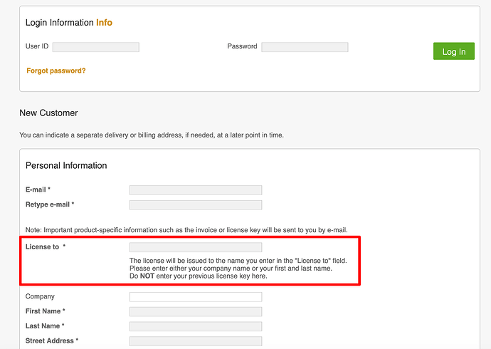 When you order a license, our distributor share-it handles all the financial transactions, invoicing and also the license key generation. To ensure, the registration name (licensed to - text) of your license reflects your company name, make sure the “license to” - value during the order process is correct. Our distributor also share-it allows you to register an account with them to make the order process easier. The following instructions should help you to correctly register the license to your company name: