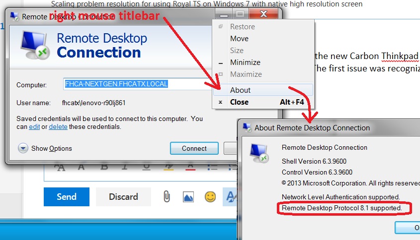 Finally, was able to debug the problem with screen resolution on the new Carbon Thinkpad. Ultimately, the RoyalTS did perform as it was supposed to but had important prerequisites. The first issue was recognizing that we had Windows 7 rather than Windows 10. Windows 7 did not ship with the correct scaling pieces: requires updates to scale correctly.
