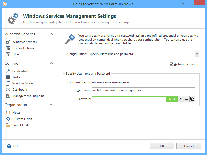 Managing a Windows Server remotely requires a windows account with sufficient rights (aka local admin rights). Usually, there is already a management account that can be used. Configure this account in the Credentials panel: