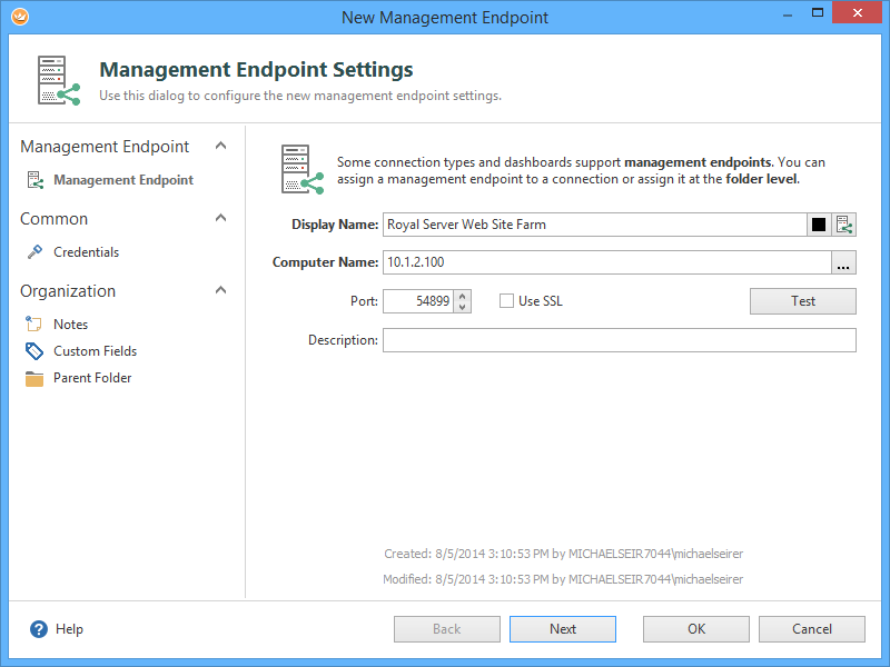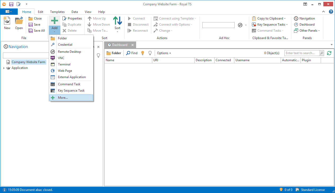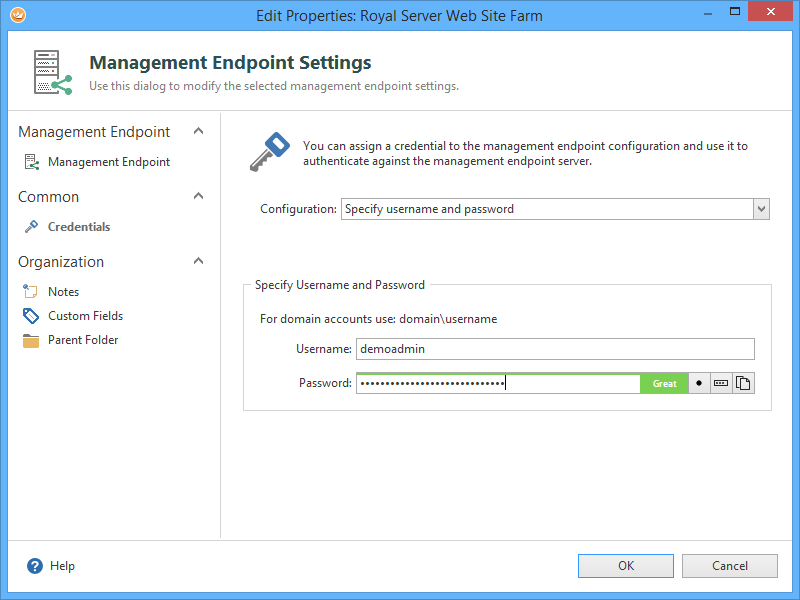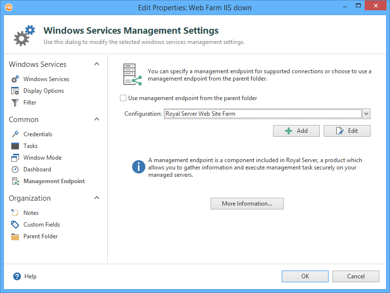 We create an empty Royal TS document (“Company Web Site Farm”) and delete all default folders (Connections, Credentials, Tasks). Then, we add a Management Endpoint – it encapsulates all information that is needed to communicate with Royal Server. Typically, you have one Management Endpoint for each Royal Server installation.