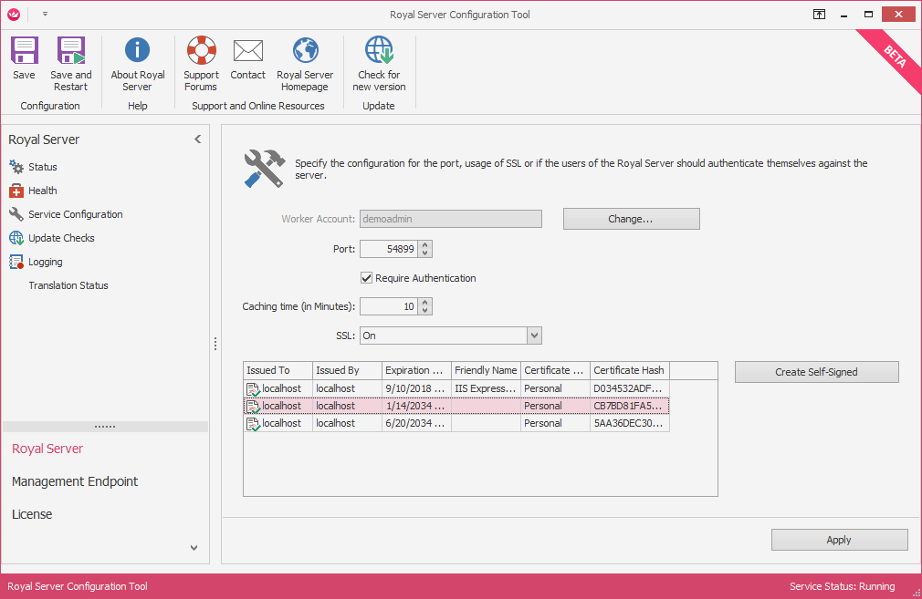 After you have changed the configuration, click “Apply” and “Save and Restart”. Royal Server will be restarted for the new settings to take effect.