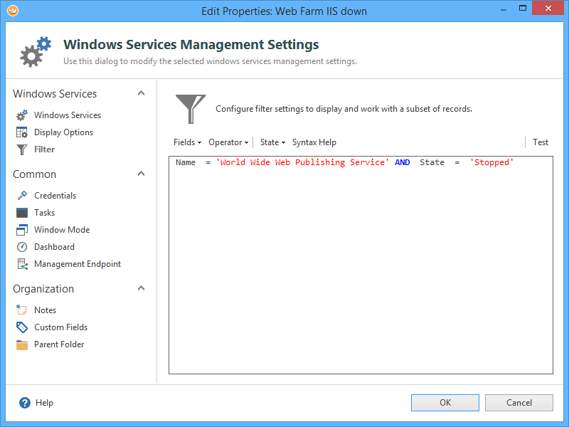 For this tutorial, we want to prepare a view that shows all web servers, where the “World Wide Web Publishing Service” is stopped (which is not a good thing for a web server):