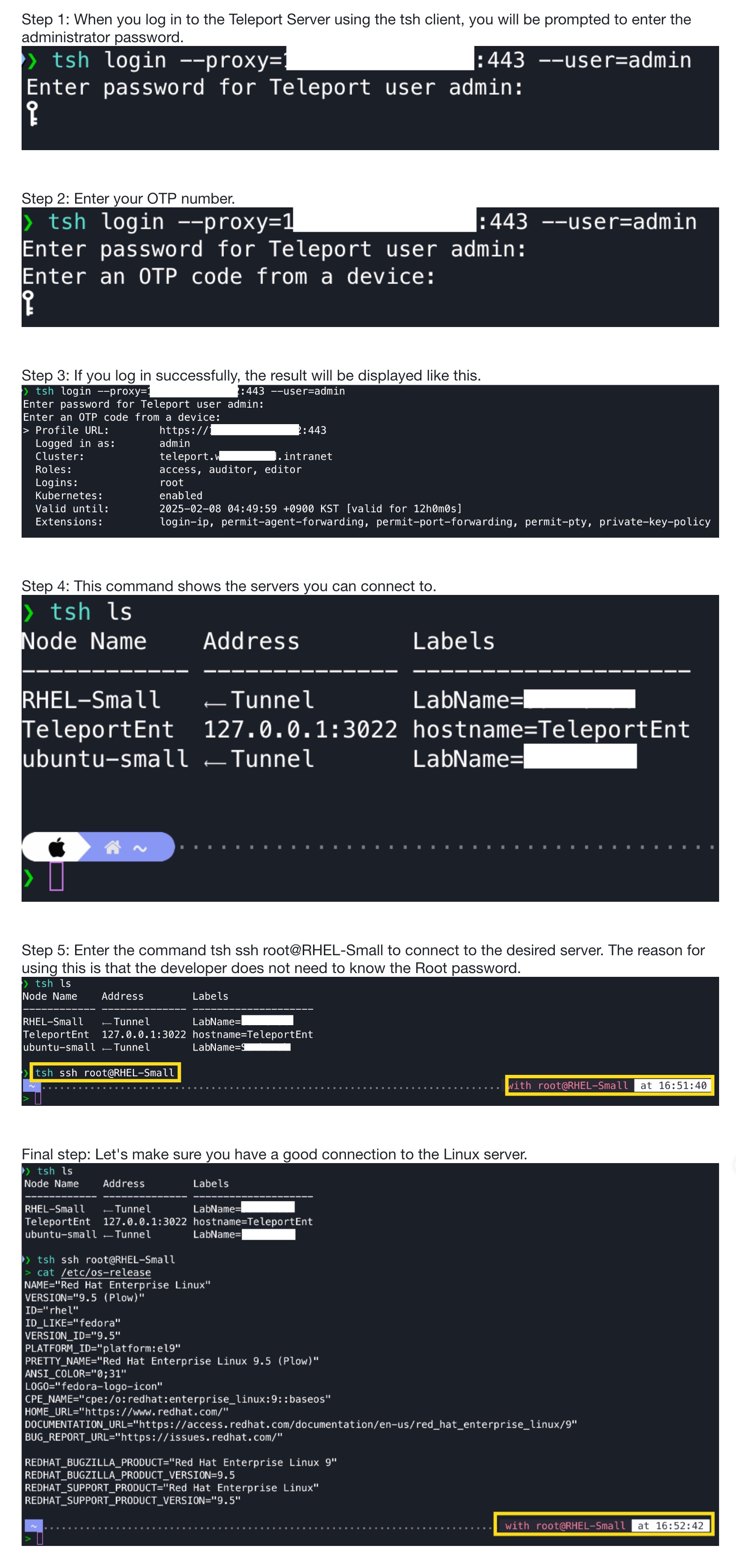 When logging in with tsh, log in with the user ID and password issued by Teleport, and enter the two-factor authentication (OTP).