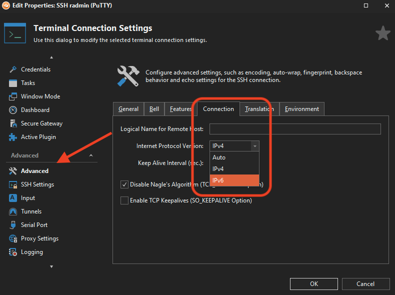 as my provider is increasing the costs for IPv4 I move all my SSH and OS stuff to IPv6. When I try to connect to an IPv6 host via the putty terminal plugin I get the error “Unable to open connection to … Host does not exist”. IPv6 SSH works when using rebex plugin though, but I need SSH tunneling as I won’t expose all stuff to the external world and this is only supported via putty plugin or with Royal Server which I haven’t (right now at least).