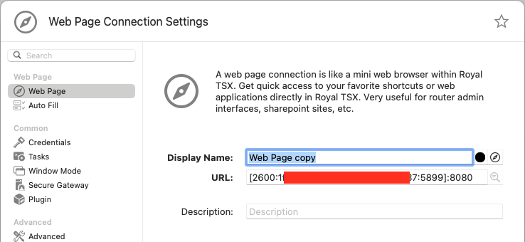 I have a Secure Gateway set up in RoyalTSX 6.2.1, which is a jumpbox in the public subnet in AWS. I am using it to get to EC2 instances in the private subnet over SSH/RDP/HTTP. Everything works great except IPv6 Web Page connections.
