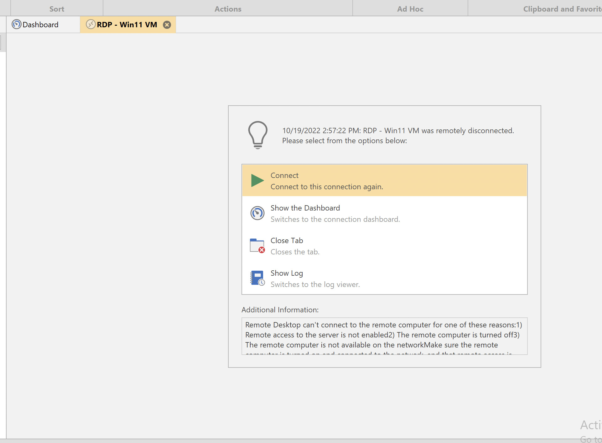 If I attempt a reconnect to a box mid reboot that connection fails and the tab closes. I would an option that will keep the tab open until manually closed. This is the default behavior of similar software such as mRemoteNG. By doing this I can initiate a reconnect multiple times until the server is available again.