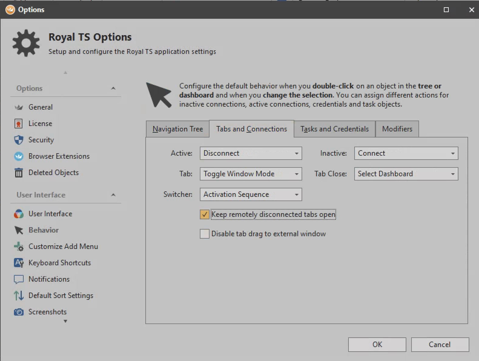 this can be enabled within the Royal TS Options > User Interface > Behavior > Tabs and Connections section, as shown here: