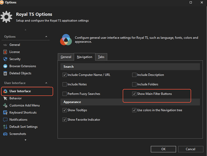 Furthermore, you can display the icons in the Navigation Search bar, by heading to the User Interface options and enabling the ‘Show Main Filter Buttons’ checkbox.