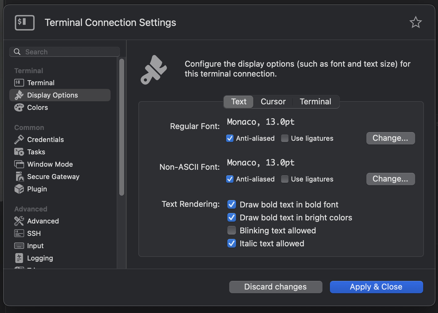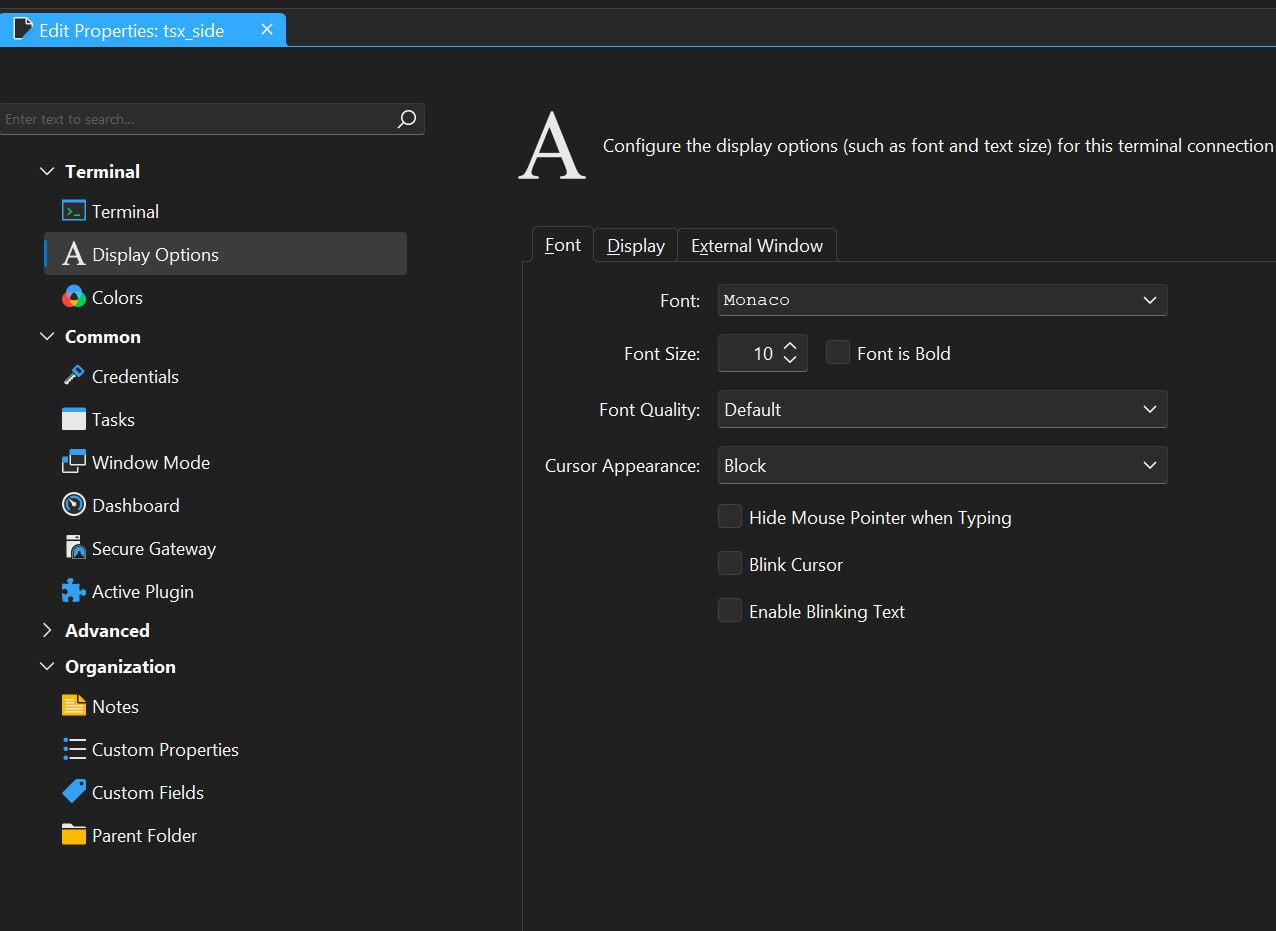 “need to adjust the configuration on both platforms.” - yeah this is not clear because I wanna some “automatic” solution for the all connections created on TSX side and openned from TS side because if I do the same vice versa and create connection on windows side and set “Monaco” as a font it works well from MacOSX side (in tsx). I just wanna have same front the both sides without manually reconfiguring each terminal connection every time when I move from TSX into TS.