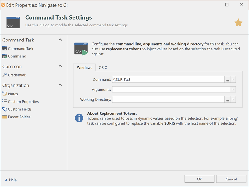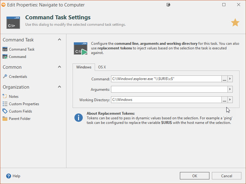 Is there a way I can setup Royal TS v4 to open a connections computer name in windows explorer? I have a LOT of servers setup in my file, and it would be awesome if I could setup maybe an ‘Command Tasks’ and have Windows Explorer try to navigate to the Computer Name setup in each connection.