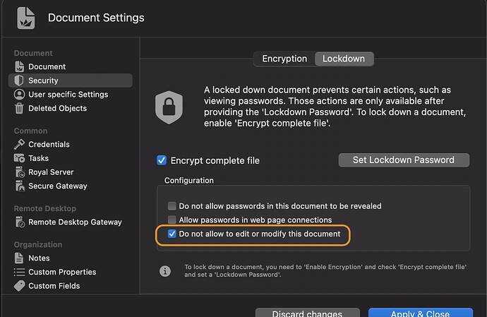 However, I had to uncheck both ‘Do not allow to edit or modify this document’ and ‘Do not allow passwords in this document to be revealed’ in order for Reload to function properly without a Lockdown password.