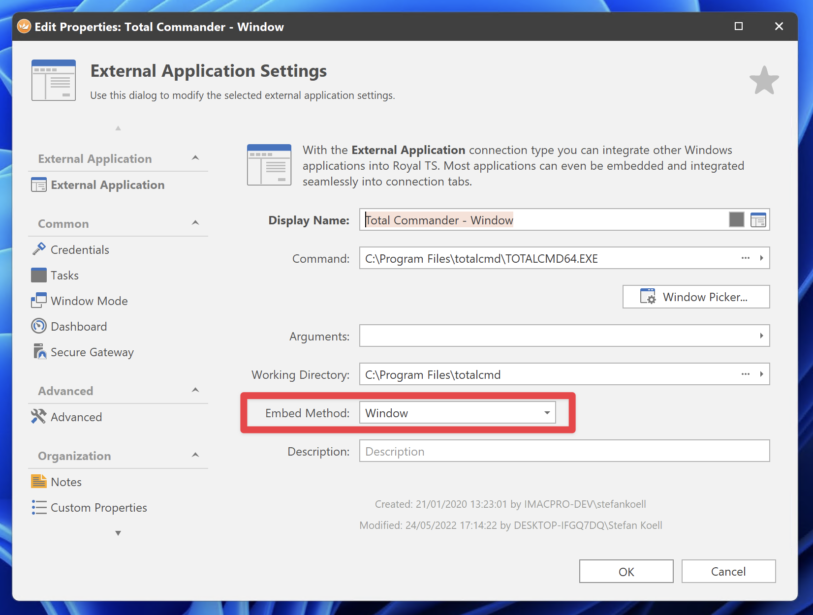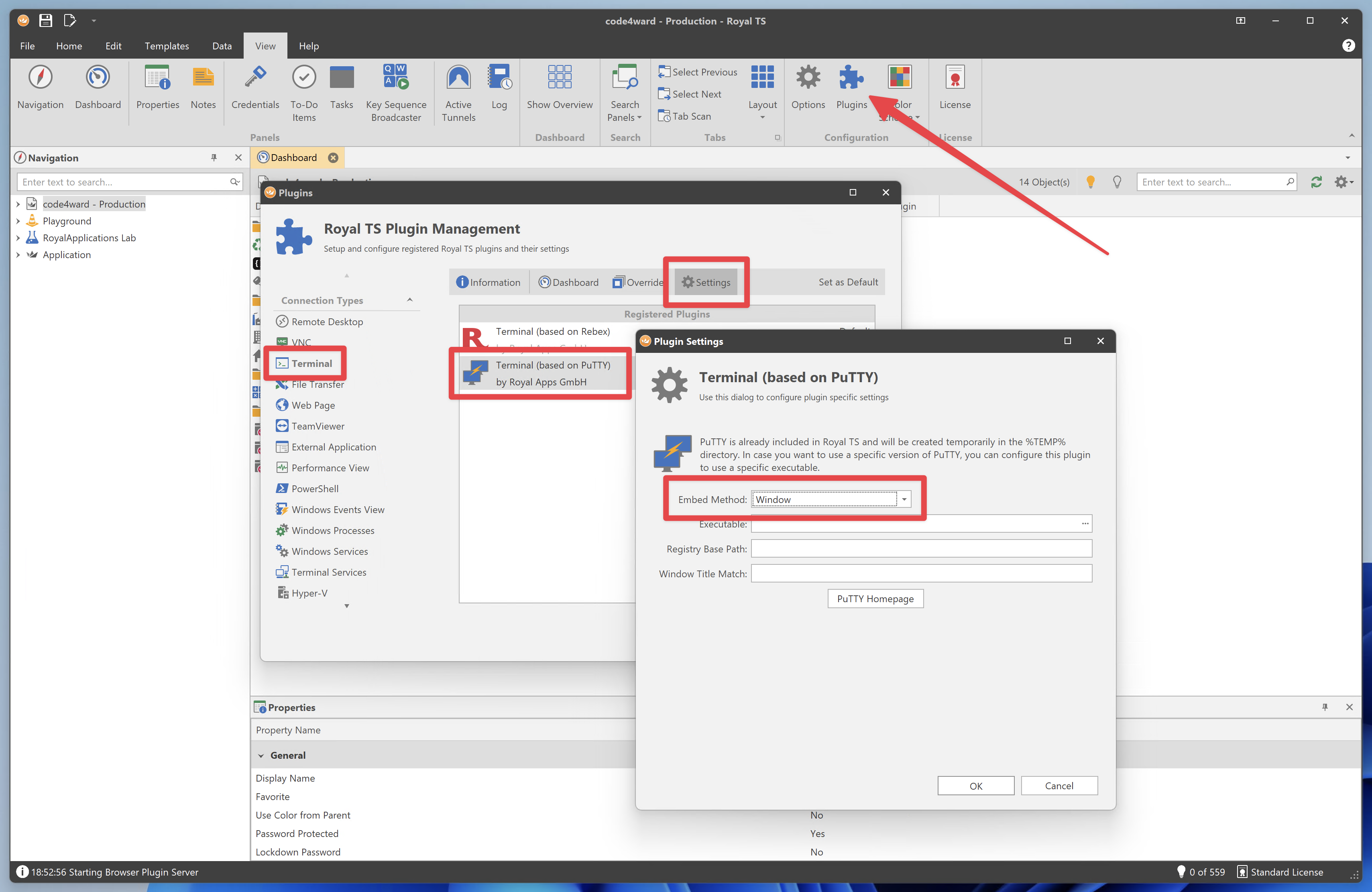 we are working on a solution where you can switch between the two implementations and hope to provide a stable system for window embedding with little side effects. One side effect we still haven’t found a solution yet is the wrong ALT-TAB order. It’s also hard to restore the keyboard focus when returning to Royal TS from another app using ALT-TAB and PuTTY had the input focus.