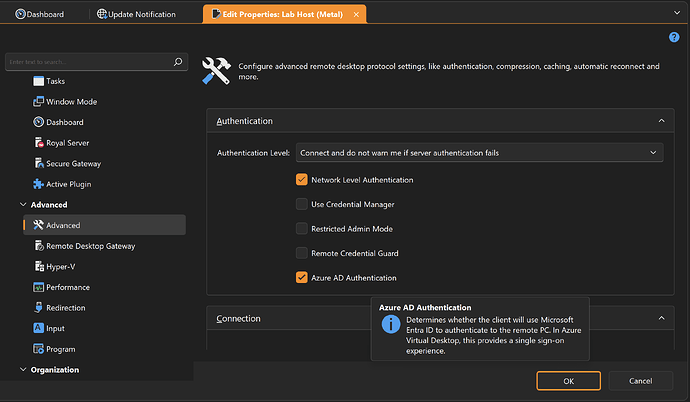 I tried with supplying credentials in the form of AzureAD<UPN>, and with NLA ON or OFF, i even tried the RoyalTS Setting of “Use Azure AD Authentication” in the Advanced Tab of the connection - with no success at all.
