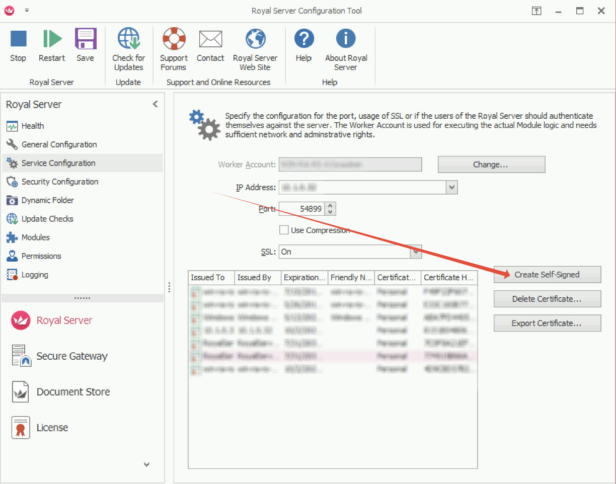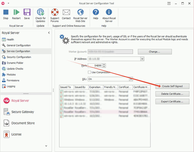 This error message suggests either a problem with the self-signed certificates or with the TLS version being used. If you get this message the first thing to check is whether or not you have already created self-signed certificates. If you haven’t, this can be done in the Royal Server Configuration Tool under “Royal Server - Service Configuration”, by clicking on “Create Self-Signed”: