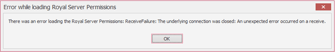 The was an error loading the Royal Server Permissions: ReceiveFailure: The underlying connection was closed: An unexpected error occurred on a receive
