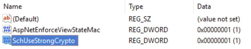 HKEY_LOCAL_MACHINE\SOFTWARE\[Wow6432Node\]Microsoft\.NETFramework\<VERSION>: SchUseStrongCrypto