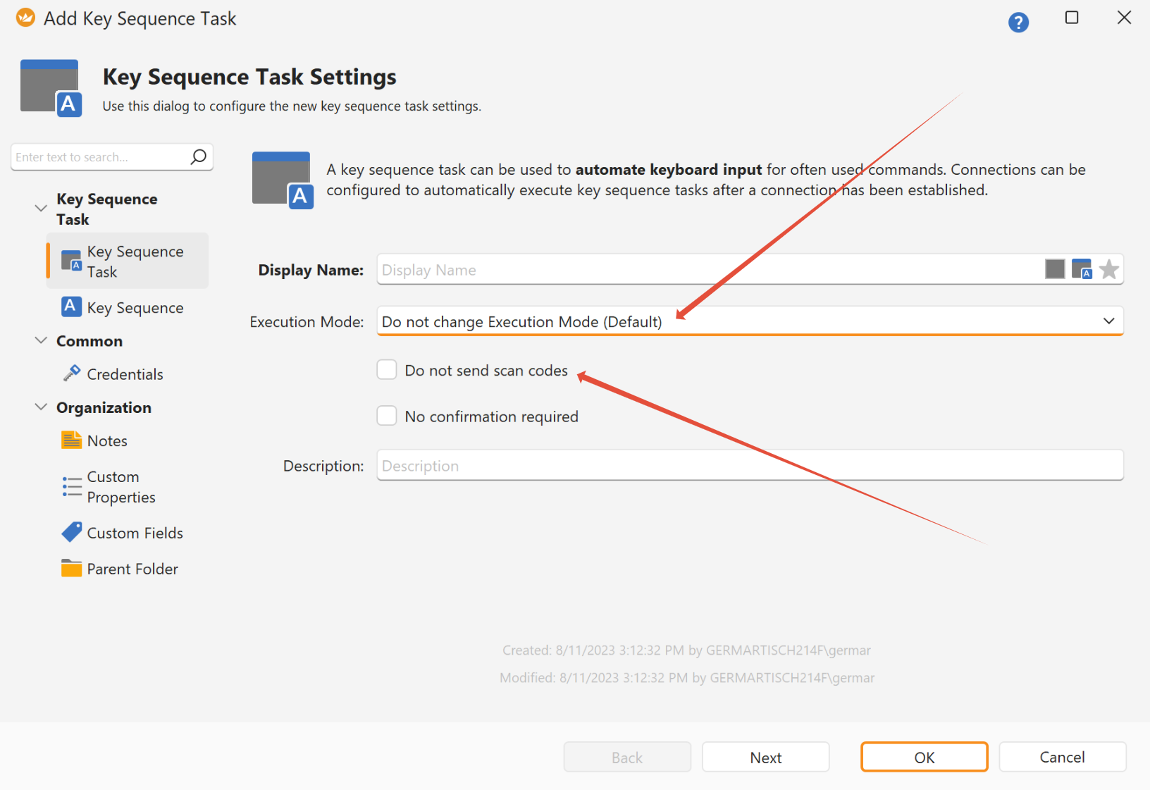 In V7 we introduced a new feature which allows you to send scan codes. Depending on the “target” of your key sequence task, the result may differ. In remote desktop sessions, for example, you may see different behavior when you send key sequences to an open command prompt window compared to a powershell window or a web browser. Different keyboard layouts can also play a role with that. So depending on your target you may want to send scan codes in order to get the correct result or not.