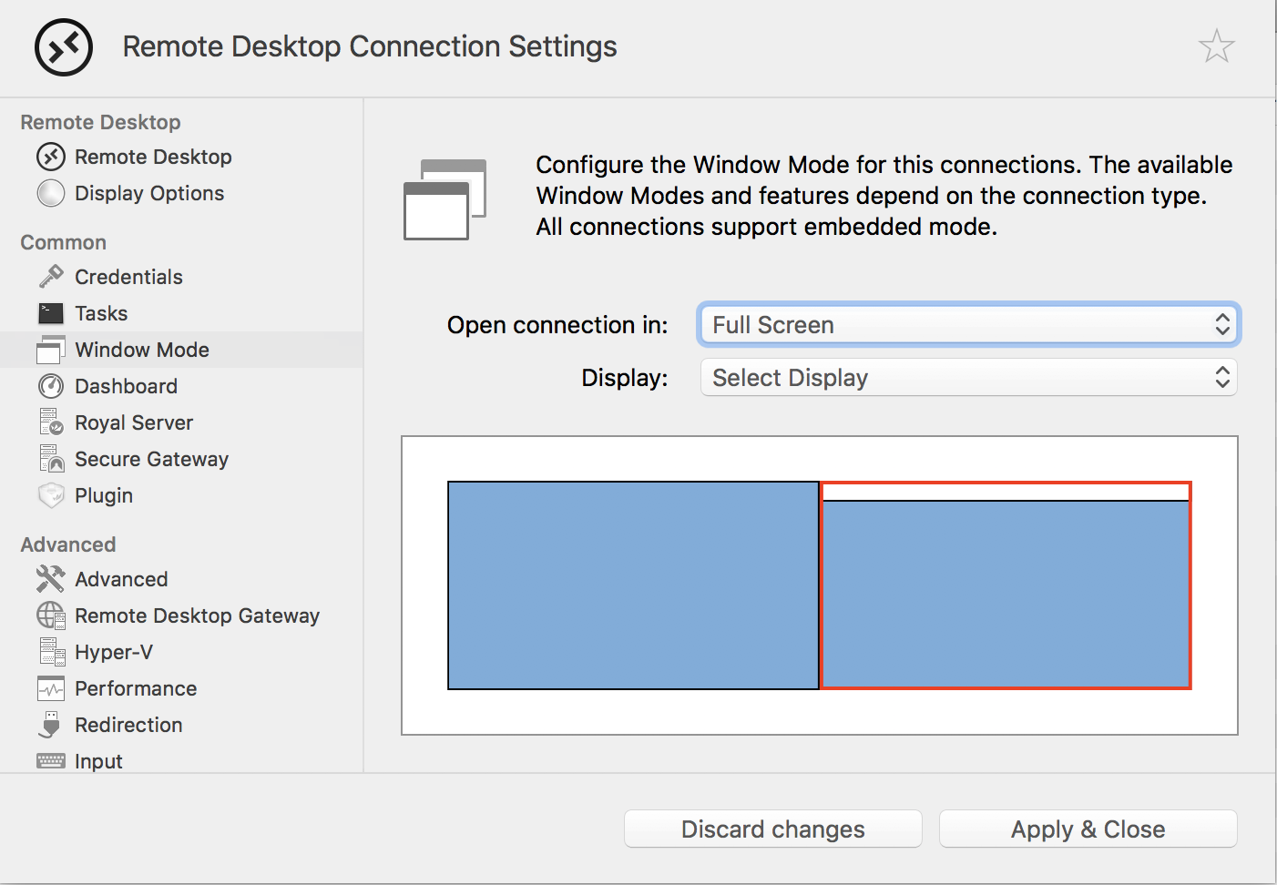 I use two external monitors connected to my closed MacBook Pro. When I use Royal TSX it is in Full Screen mode on the second monitor.