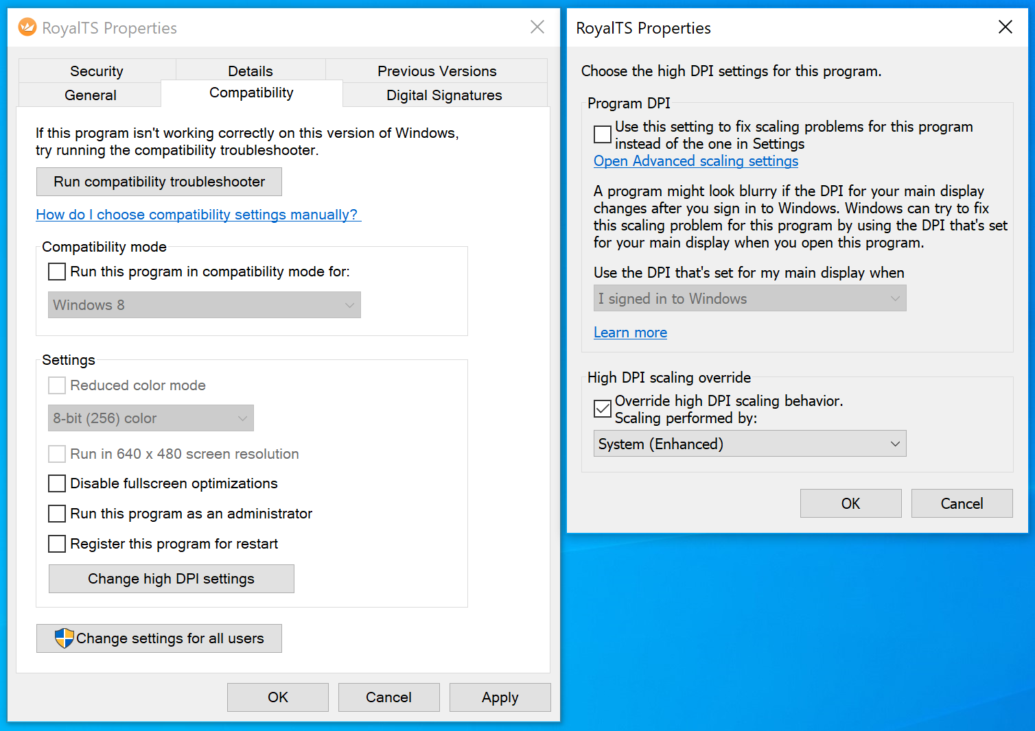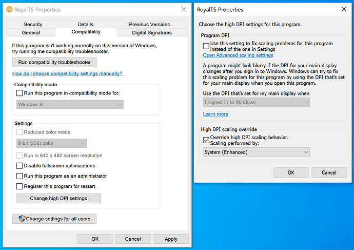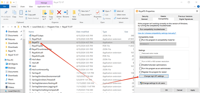 In case the above setting does not have an effect, verify that the Compatibility setting of the RoyalTS.exe file (located in the installation directory, by default in %ProgramFiles%\Royal TS V7):