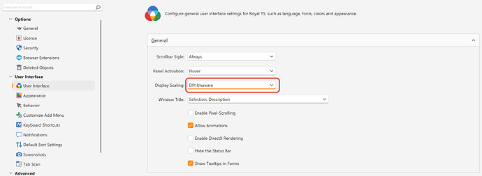 While Royal TS is now truly DPI aware, there are still some scenarios where you want to go back and uncheck the option above. Most issues with high DPI aware applications are related to the Remote Desktop Protocol (RDP connections). Microsoft introduced dynamic resolution update and scaling level update in RDP 8.1.