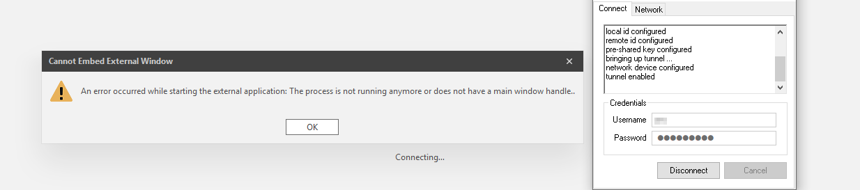 I see you are using external apps for your VPN client. External apps by default try to embed the main window of the process. Depending on how the VPN client is written (like starting a subsequent process), the message you see indicates that Royal TS cannot find an embeddable main window handle. It’s hard to tell why this is happening without knowing the internals of the VPN client.