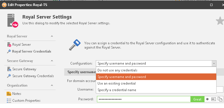when royal ts/x tries to connect a connection that is referencing a SSO credential for the first time, it asks the user for username and/or pwd and caches this for the lifetime of the application.