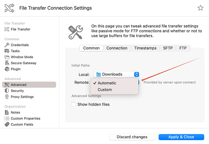 To do this, go to “Application - Default Settings - File Transfer” in the bottom left-hand corner of the Navigation Panel. Then edit the remote path under “Advanced - Advanced - Common”: