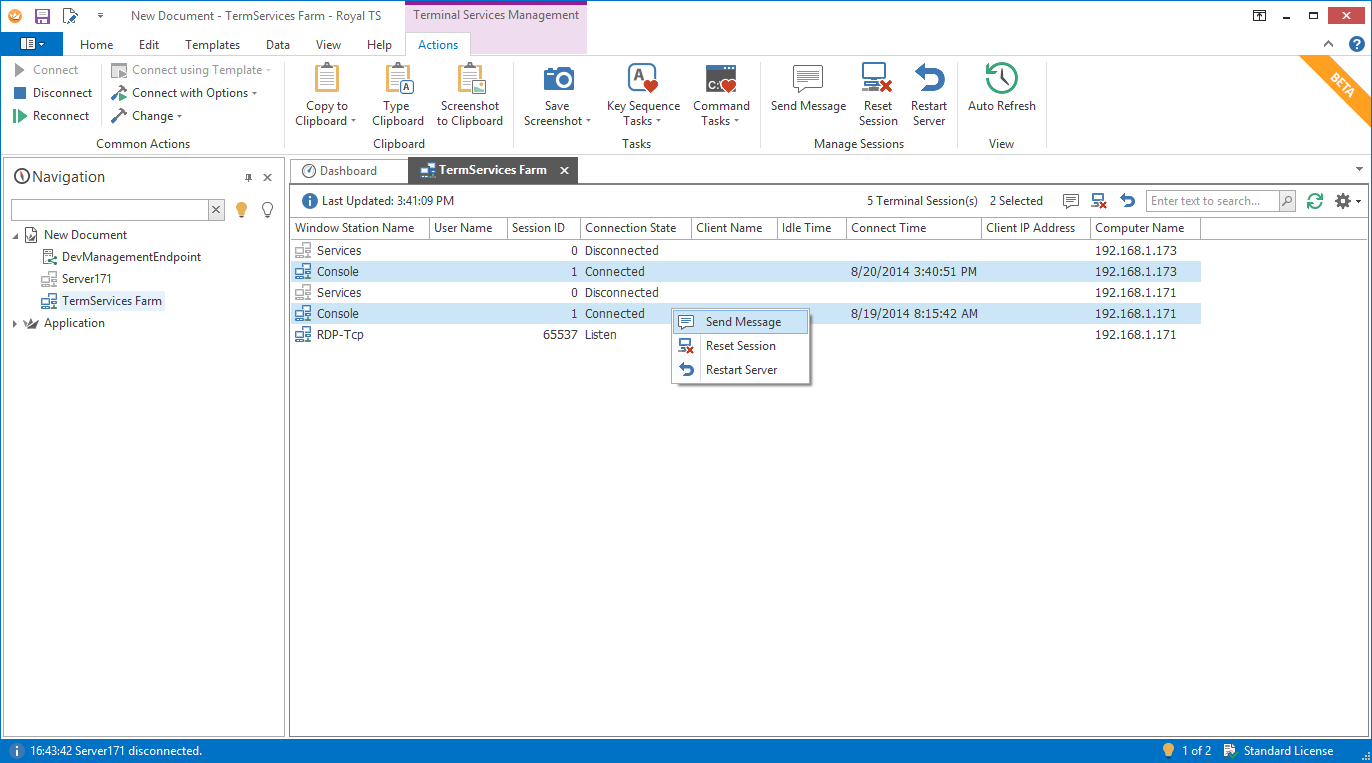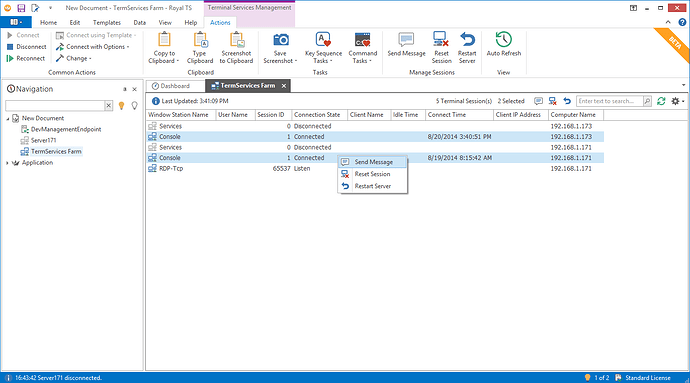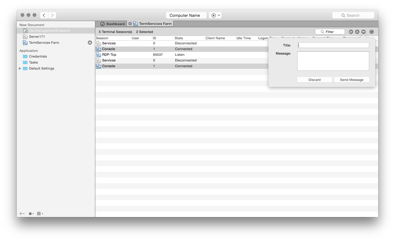 Finally you can manage your Terminal Services from macOS as well. Royal TSX V2 beta (for macOS) is introducing a new connection Type: Terminal Services. Send messages, Disconnect them and even Restart the whole server.
