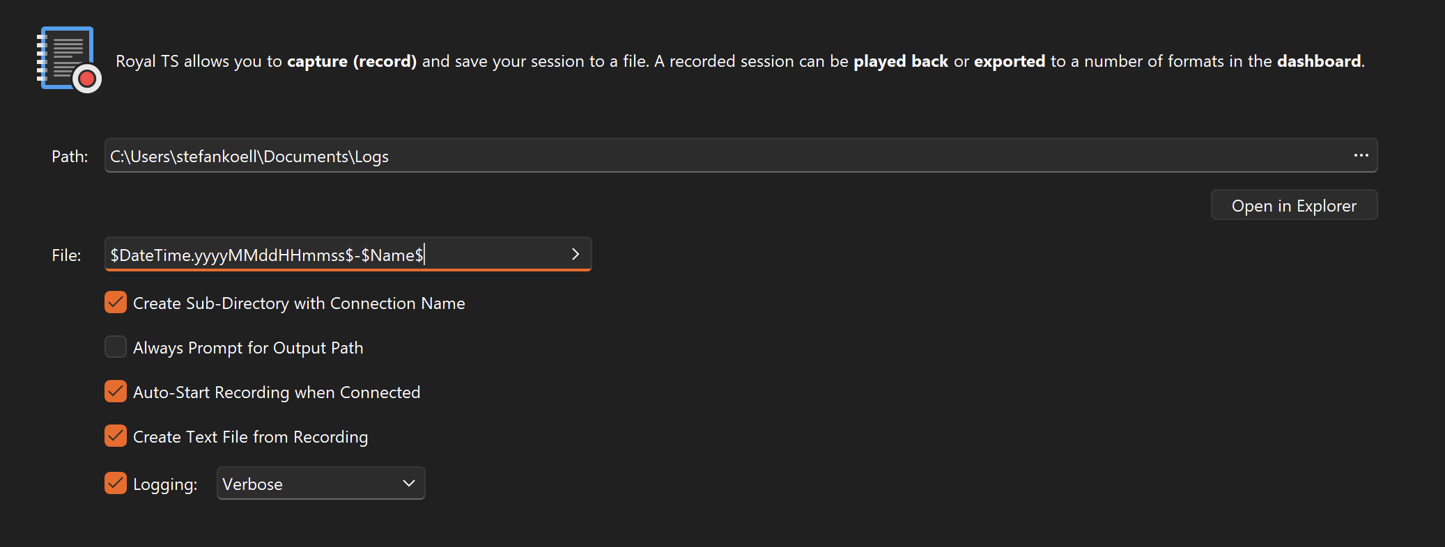 The point is that when I use ( Replacement Tokens ) like ( C:\Sessions$CustomField1$-$CustomField2$-$Name$-$URI$ ) , the result is the log file with the old name ( timestamp-connectionname ) inside a directly with the ( Replacement Tokens ) name , Which quite similer to enabling option ( ( creating a subdirectory with the connection name )