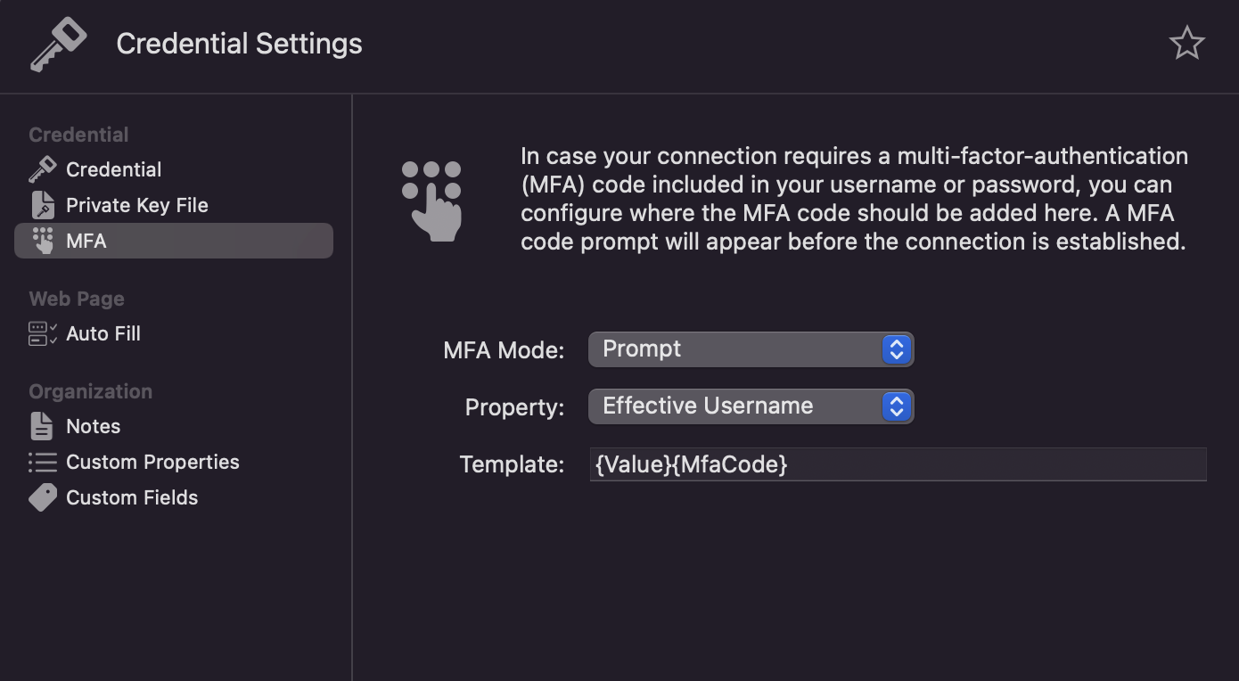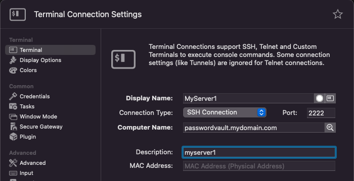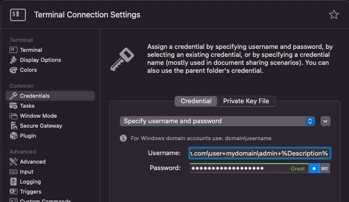 Sure thing, Christoph! Thanks for the feedback. No, I’m not looking to implement MFA tokens. Our password vault uses a very “interesting” credential string that includes an unprivileged user account, privileged user account, target system to remote into and associated authentication domains for all of the above. It looks like this: <unprivileged domain>\<unprivileged account>+<privileged domain>\<privileged account>+<target system>. All of the string is static with the exception of the <target system> which I need to be variable depending on the system we connect to. Ideally, I was trying to pull it via a name placed in the Description field, but %Description% obviously didn’t work… it was taken as a literal in the connection attempt.