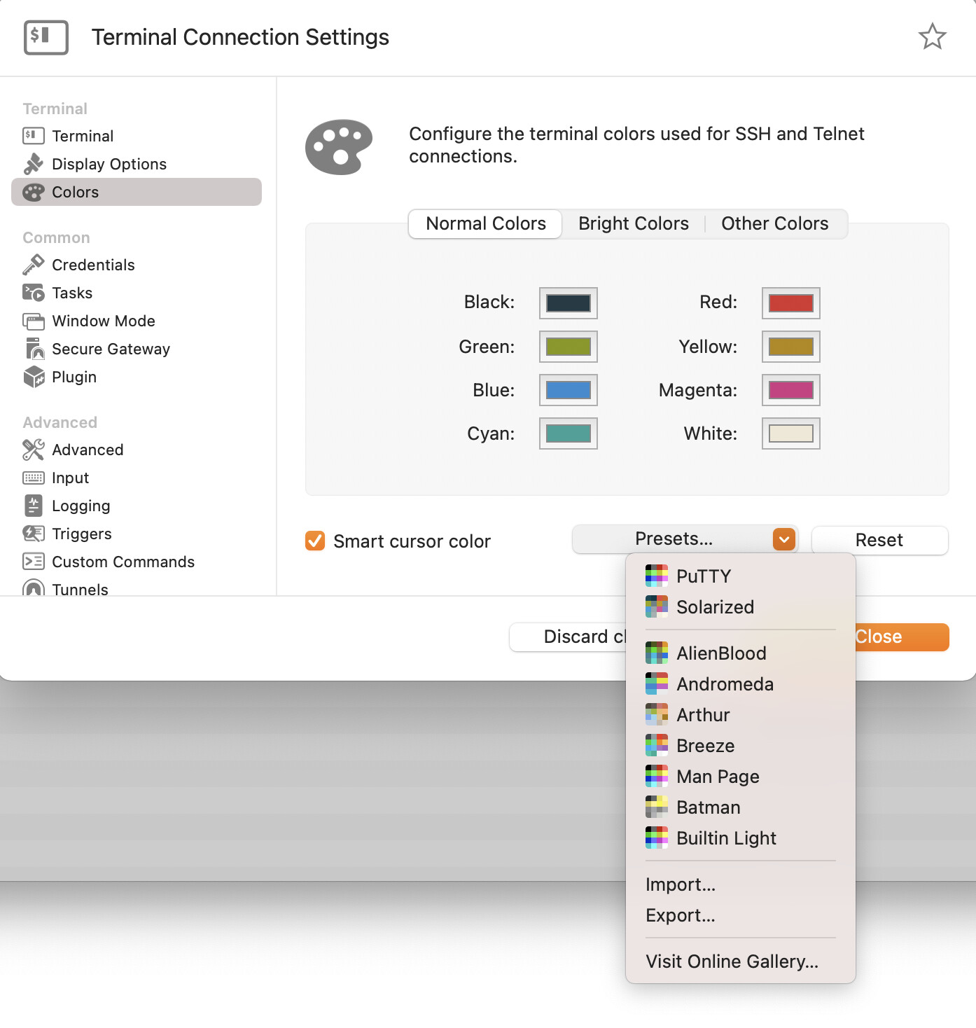 I have hundreds or CLI objects for telnet, SSH and the like. What would be really handy is the ability to have triggers or color profiles as objects, in the same fashion as you do for passwords, or secure gateways, for example.