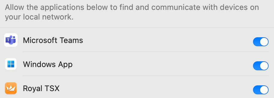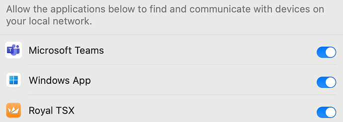 In the Privacy & Security section of your Mac System Settings, make sure that the Local Network permission is active for Royal TSX as well as the FreeRDP plugin: